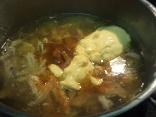 Discard bones, throw meat in the pot. Repeat. Discard any tough bits, any gristle, anything you don't think is edible (or don't want to eat). You won't get much meat from the wings, usually, but you can get a TON from the breasts. But shred it, pick it, whatever. I guess you could just have big chunks, too, but I think the shredding works best (theoretically, you could probably use a lot of boneless/skinless breast instead and save yourself time and effort, but I have yet to do so. I feel like I accomplish something because I do a tiny bit of work for a decent meal).